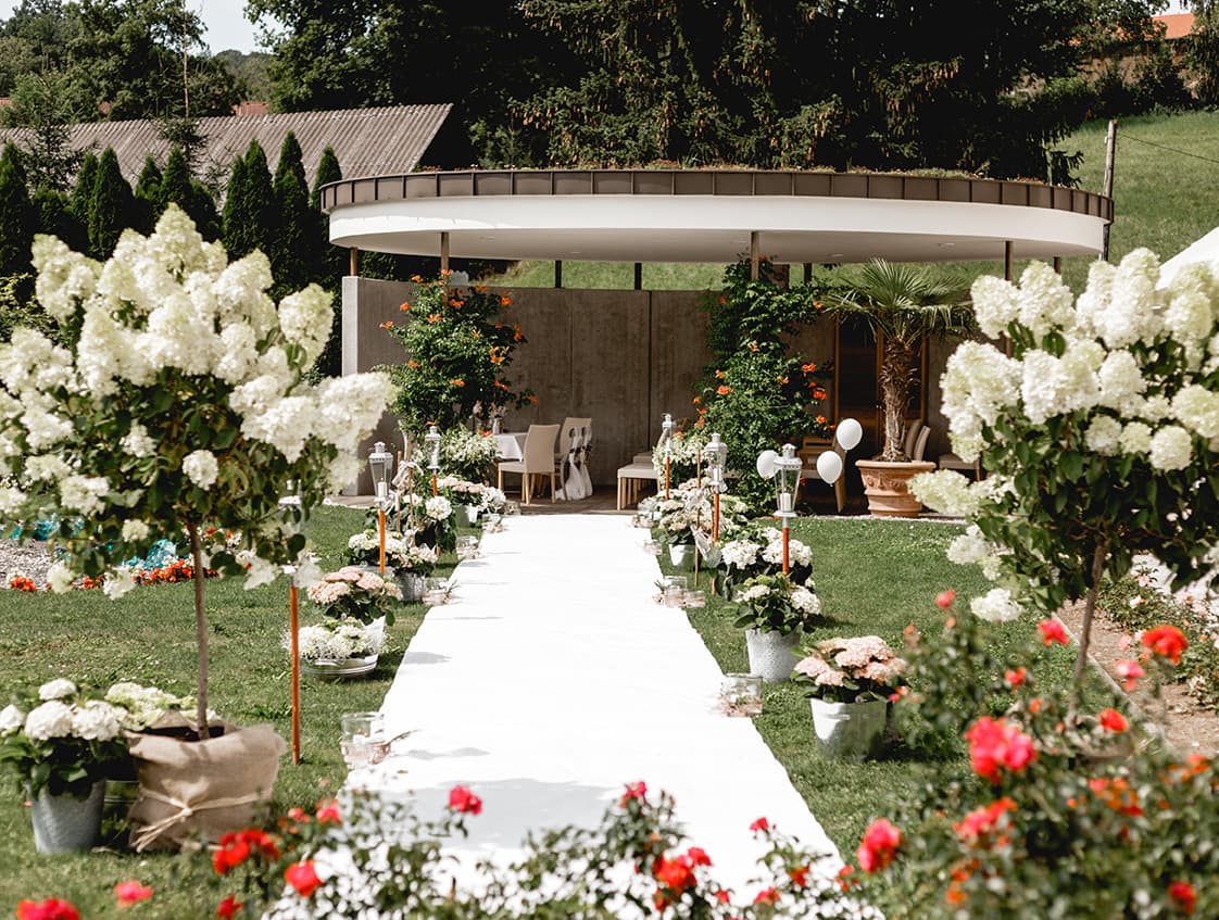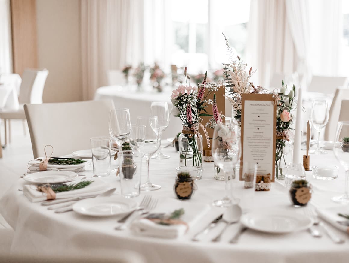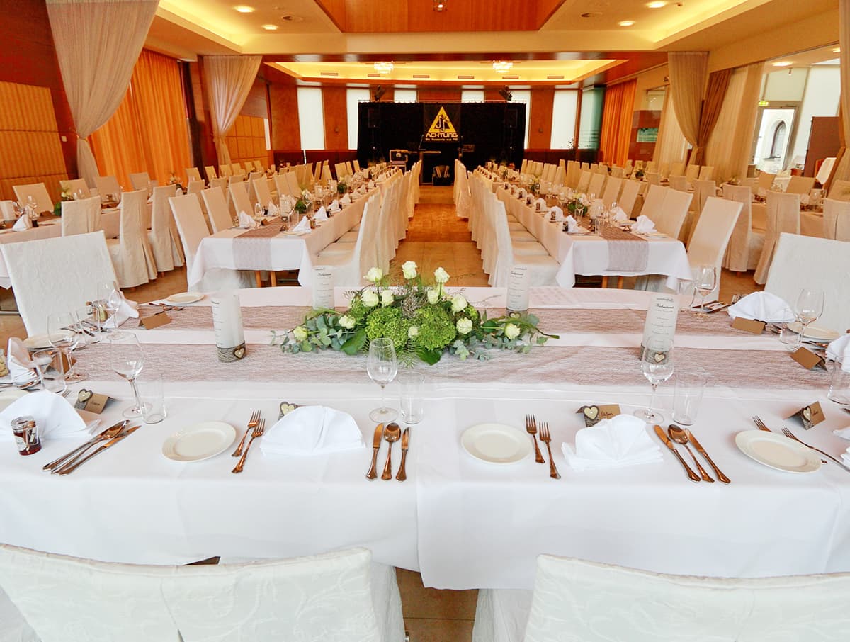 We offer you all services – both indoor and outdoor, everything for catering, organisation of flowers and decorations through to overnight accommodation for your guests – from a single source. The best thing is that you only have one contact person with us, who will accompany you from the initial contact to invoicing. It couldn't be simpler!